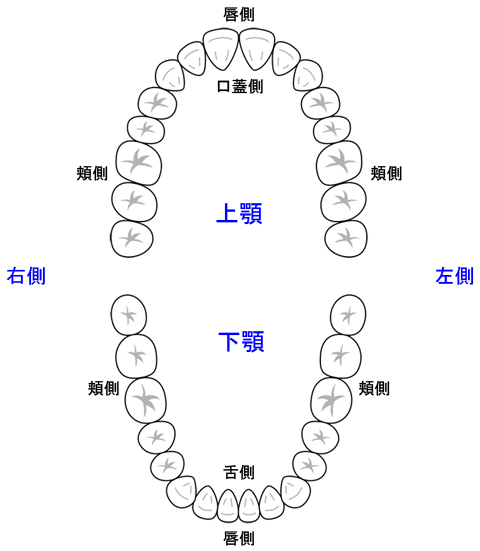 頬側(きょうそく) 臼歯部の歯のほお側(歯の外側)のこと。